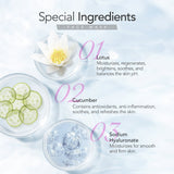 Water, Glycerin, Propanediol, Nymphaea Alba Flower Extract, Cucumis Sativus (Cucumber) Fruit Extract, Biosaccharide Gum-1, Sodium Hyaluronate, Butylene Glycol, Propylene Glycol, Hydroxyethyl Urea, Carbomer, Xanthan Gum, Peg-40 Hydrogenated Castor Oil, Disodium Edta, Triethanolamine, Phenoxyethanol, Methylparaben, Propylparaben, Parfum
